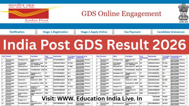 India Post GDS Result 2026 PDF Education India Live. Com: यहां से इंडिया पोस्ट जीडीएस का रिजल्ट देखें